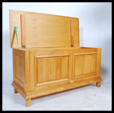A 20th century large pine blanket box hinged lid to top with fitted sliding storage raised on square feet. 60x118x49