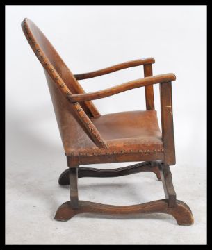 An Early 20th Century Art Deco leather backed X framed tub chair with impressed armorial crest to the back panel. 75x52x51