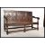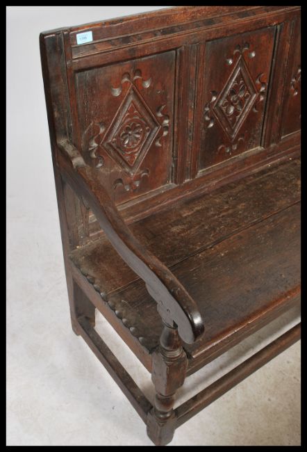 An early 18th century country oak settle bench. The back with recessed fielded panels over a bench seat curved arms and a bench seat with loose cushion. All raised on turned and block front supports united by stretchers. 93x155x56