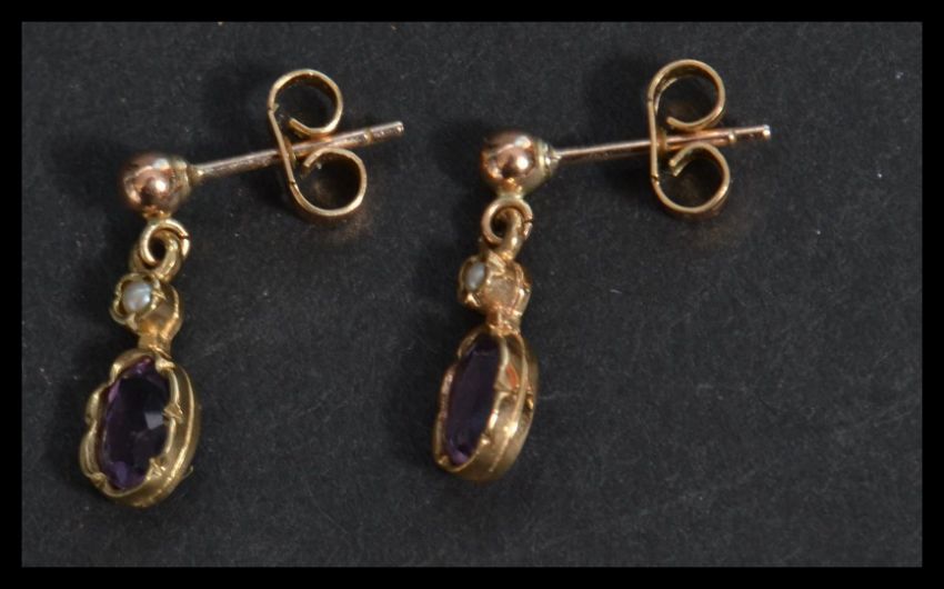 A pair of hallmarked 9ct gold earrings set with amethyst stones and seed pearl. Hallmarked London. Weight 1.4g.