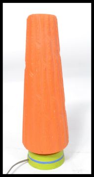 A retro 1960's table lamp having a striped green and blue lamp base with wonderful conical orange bark effect shade ( see illustrations ). Measures 46 cm high.