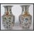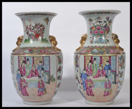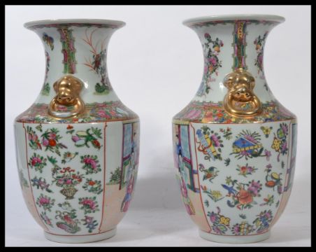 A near pair of Oriental Chinese ceramic vases one being an 18th century example with famille rose medallions and cartouche panels depicting traditional scenes having gilt Fu dog handles. Ochre red character marks to base. The other being a later 19th century example of the same vases.
