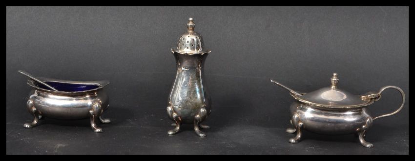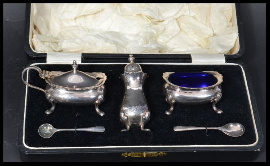A vintage 20th century Regis plate silver plated condiment salt set in fitted case. Blue glass liners makers stamps to base. Case measures 22.5 cm wide.