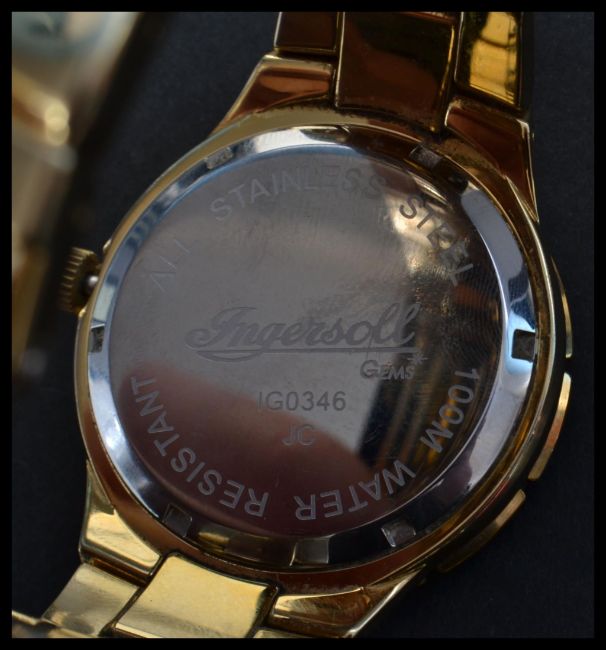 INGERSOLL GEMS WRISTWATCH. Boxed, Ingersoll gems red faced date dial wristwatch with gem encrusted bezel on yellow metal strap, in working order.