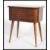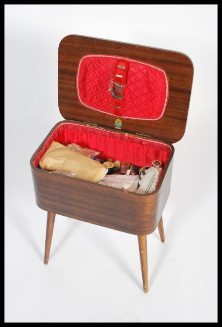 A vintage retro 20th century teak sewing box raised on tapering legs with hinged lid opening to reveal a quantity of sewing equipment and contents. Measures 49cm x 43cm x 30cm.