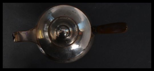An 18th century Georgian silver plated Argyle raised on a circular foot with beaded border. Shaped wooden handle with bell shaped finial. Measures: 20cm high.