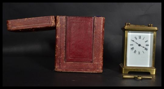 An 19th century brass carriage clock with inset French movement. Enamel face with roman numeral chapter ring and faceted hands. Handle over open window escapement. Complete with the leather carry case. In case measures 16 cm high.