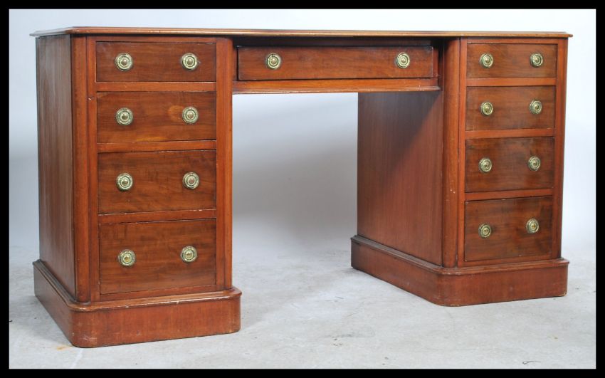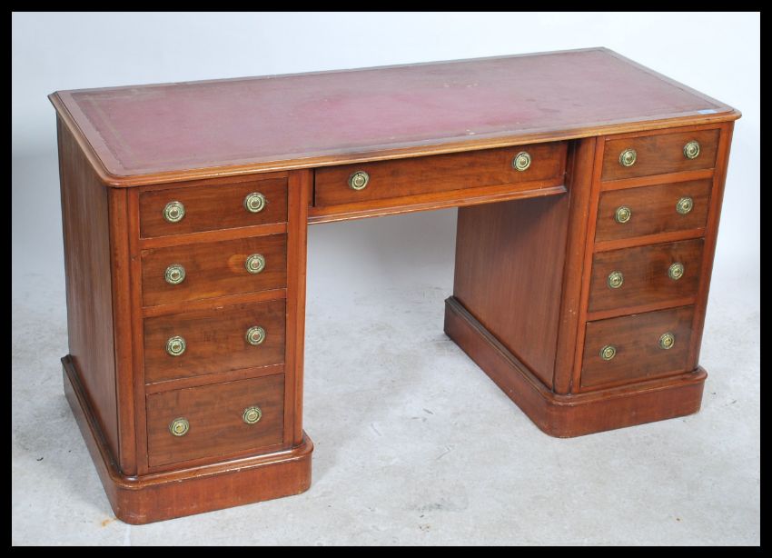 A good Victorian mahogany inverted breakfront twin pedestal desk with tooled red leather skiver, the drawers with ring drop handles on circular back plates. 75x137x56