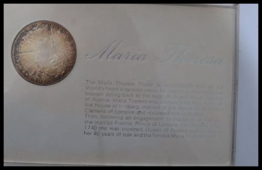 A collection of coins to include a Franklin Mint Cook Island Proof Set , Baliwick of Jersey 25 pence coin x2 , Maria Theresa coin in case , Apollo-Soyuz Space Mission coin , Republic of Seychelles 25 Rupees coin. Please see images.