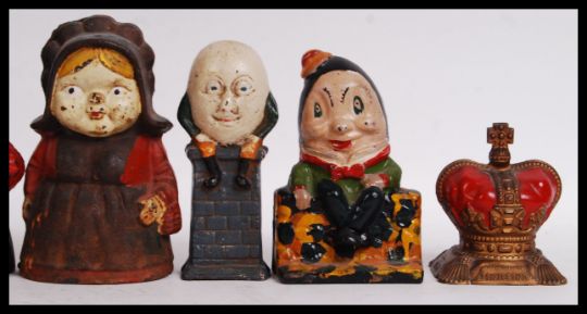 An assorted collection of vintage style 20th century cast iron money banks comprising of; Michelin Man, paupers, Humpty Dumpty, Transvaal, royal crown & others. Tallest measures 23cm.