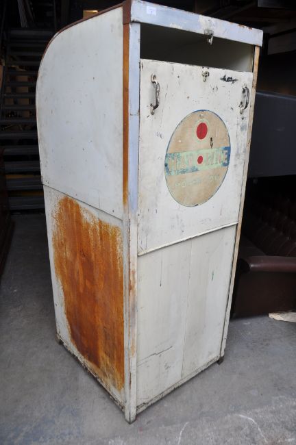 An early 20th century Havoline Motor Oil forecourt oil dispensing cabinet. Having an arched roof with drop door revealing dispensers over further cabinets beneath