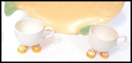 A set of retro Shorter and Sons fish ( plaice ) plates to include a serving plate and dinner plates together with a pair of Carlton Ware tea cups in the form of egg cups on legs. Widest measures 38.5 cm.