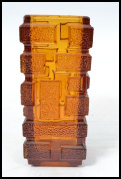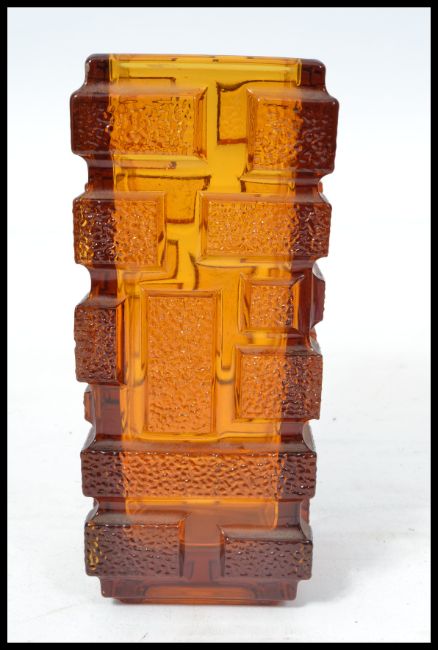 A vintage Whitefriars style orange glass brick vase having a textured brick design. In the manner of a Geoffrey Baxter Drunken Bricklayer Vase. Measures 22 cm high.