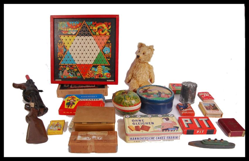 An assorted collection of vintage 20th century children's toys & games to include; mohair teddy bear, jigsaw puzzles, Sovereign King of All Toffees tin, papier mache various sized eggs, aluminium plane, Contraband Card Game, packs of cards, decorative tins & others.