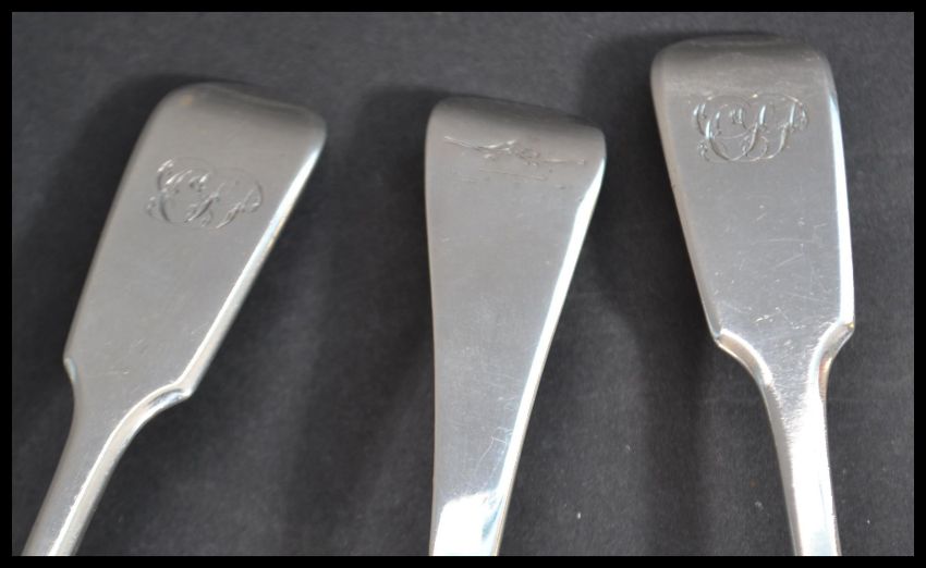 A group of three 19th century silver hallmarked sauce ladles to include a Victorian pair by William Robert Smiley hallmarked for London 1857 in the fiddle pattern and a Georgian sauce ladle by George Wintle 1811 in the Hanoverian pattern. Total weight 128 grams.