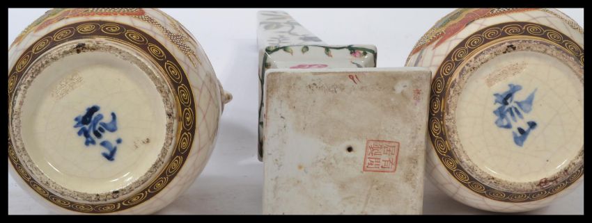 A pair of 20th century Japanese Satsuma bulbous vases with scenes of warriors, character marks to base together with a Chinese ceramic obelisk decorated with passion fruit and butterflies. Highest measures 43 cm.