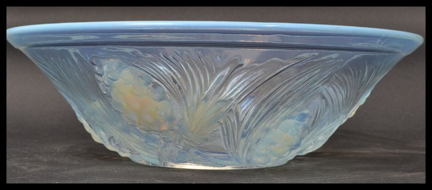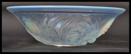 An early 20th century French pressed glass bowl having opalescent colouring with grape and vine decoration. Reg No 777133. In the manner of Lalique. Measures 8.5 cm high and 27 cm diameter.