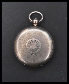 A 19th century silver hallmarked cased pocket watch by William Hammon London 1878. The white enamel face having a Roman numeral chapter ring with faceted hands. Subsidiary dial and bail loop ring to top. Weighs 199.8