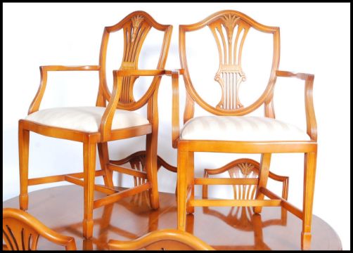 A regency style yew wood pedestal dining table together with a set of Hepplewhite style dining chairs to include the carvers ( 6 total ). Measures: 77cm high x 163cm wide x 99cm deep.