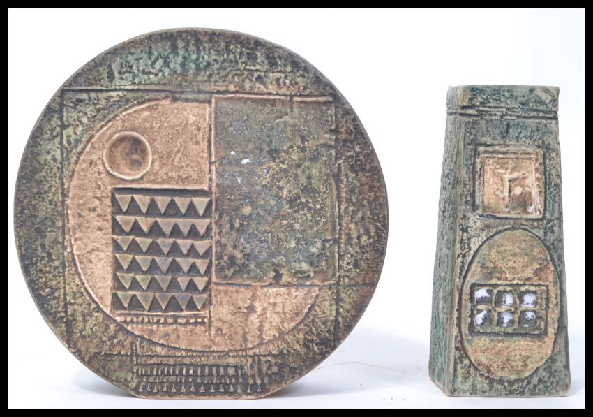 A vintage 20th century Troika Cornwall studio pottery vase of tapering form along with another very similar piece of circular form unsigned but stamped with an F.