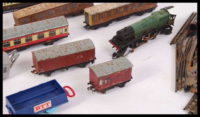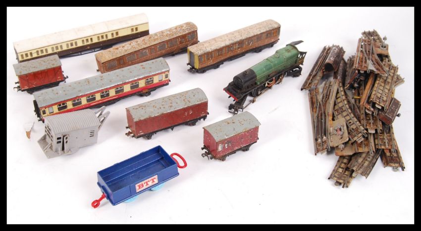 A collection of loose vintage Hornby Dublo 00 gauge railway trainset carriages, with a collection of assorted rolling stock & track.