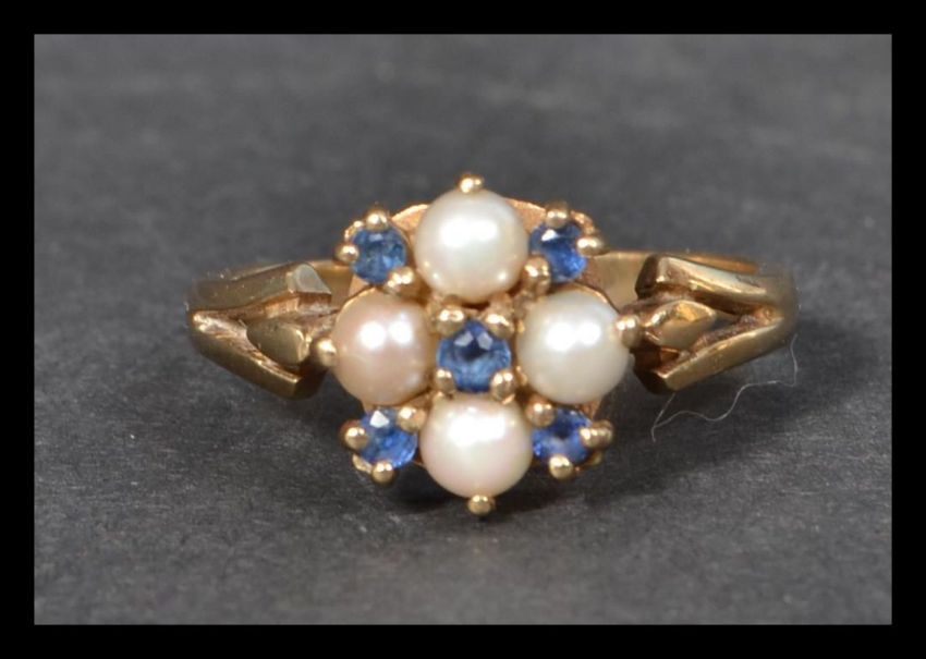 A hallmarked 9ct gold sapphire and seed pearl ring. Hallmarked Birmingham. Size P. Weight 3.1g.