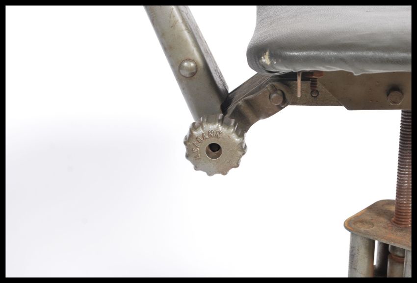 A vintage mid 20th century retro industrial machinist chair by Leabank raised on yellow tubular legs with adjustable back rest and seat.  Stamped Leabank.