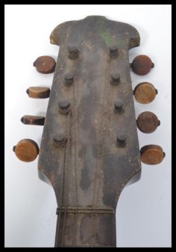 A vintage 20th Century eight string acoustic mandolin, mother of pearl inlays to the fretboard / fingerboard and fruit wood turners to the head. Measures 60 cm high.