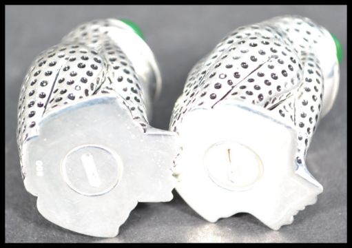 A pair of continental silver condiments in the form of toads having large green stone eyes. Weighs 96 grams.