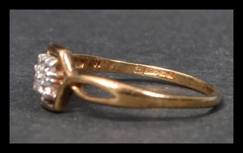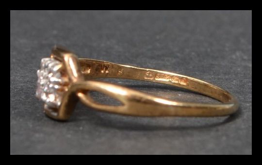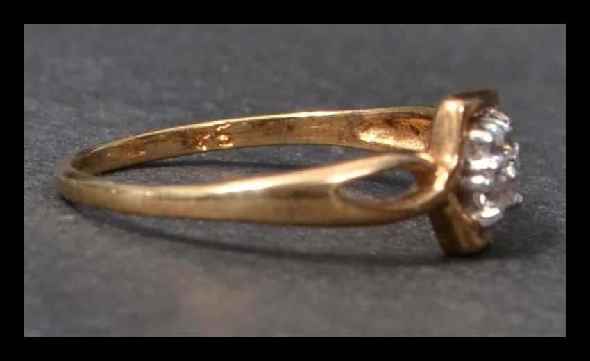 A hallmarked 9ct gold and white stone ring having four white stones in a Art Deco style setting. Hallmarked Birmingham. Weight 1.3g. Size O.