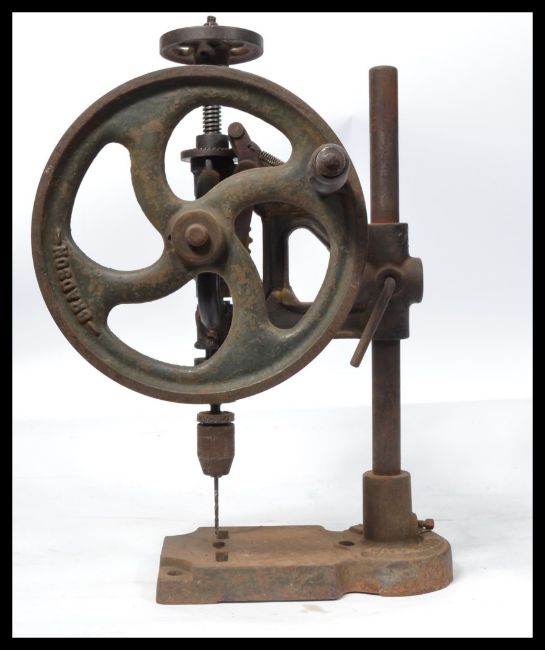 A vintage  early 20th Century Bradson cast iron bench drill model number 1 mounted on heavy base with hand crank to the side. Measures: 55cm high.