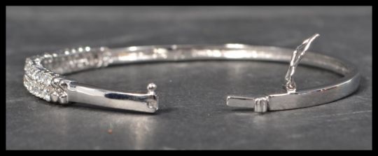 A sterling silver and CZ bangle bracelet having two lined of white CZ stones with hidden clip clasp.