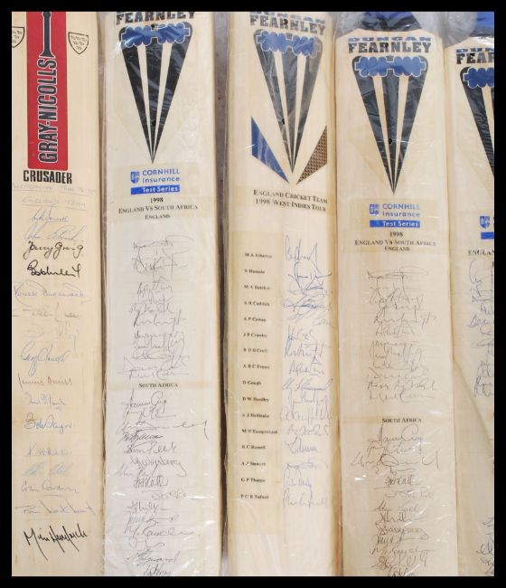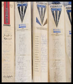 A collection of autographed cricket bats presented to Ian MacLaurin, Baron MacLaurin of Knebworth to include England Vs South Africa 1998 x3 , England Cricket Team 1998 West Indies Tour , 2001 Test Series England , Coca-Cola cup Sharjah April 1999 , 1997 England vs Australia England , 1998 Wills International Cup England Cricket Team.