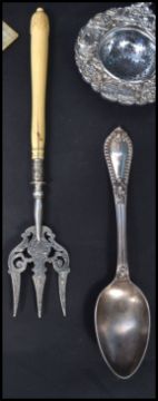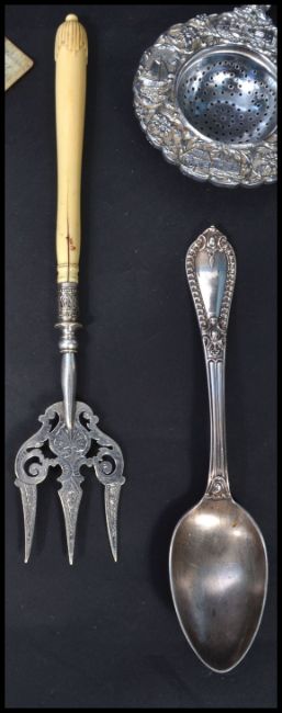 A collection of items to include a 19th century tortoiseshell lidded trinket pot, silver plated tea strained, Ivory handles toasting fork, Ivory aide memoirs etc. Longest measures 23 cm.