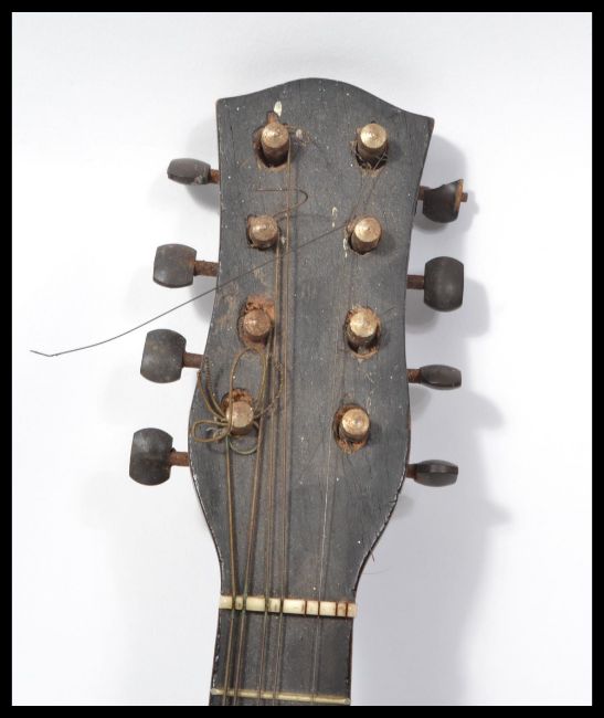 An early 20th century banjo Mandolin. The circular body having 8 strings to the neck with inset mother of pearl fret markers. Measures 55 cm high.