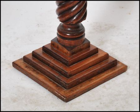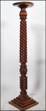 A 19th century Victorian barley twist carved wooden torchere plant stand raised on a quadruped stepped square base with circular top.