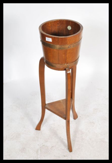 A 19th century coopered oak and brass bound barrel planter - plant stand torchere by Lister of Dursley. Raised on squared supports with cross stretchers having an oval barrel top with fabulous polished brass bindings. Makers label within. Measures 92cm x 38cm x 38cm.