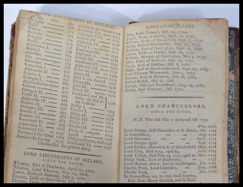 'The Tablet of Memory' showing every memorable event in history to 1774. With an exact history of painters and eminent men. Leather bound with marble boards. Printed for J. Bew. Measures 13 cm high.