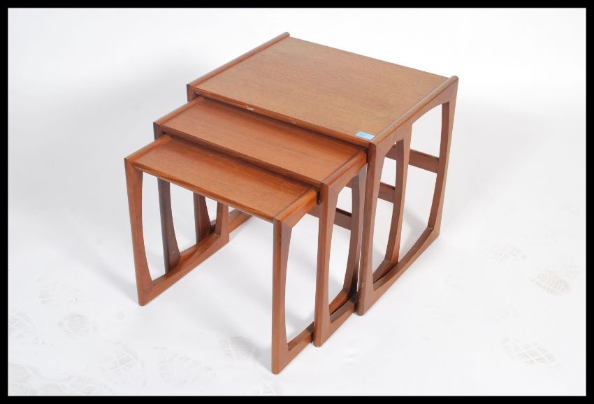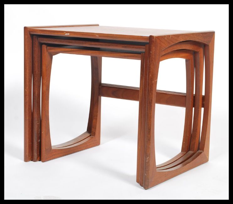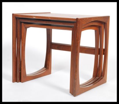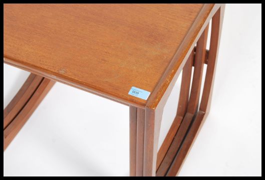 Victor B Wilkins - A G-Plan retro teak wood 1970's graduating nest of tables in the Quadrille pattern. The tables having angular legs united by reverse stretchers with graduating table tops above. 49cms High x 53cms wide x 43cms Depth.