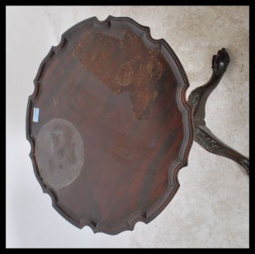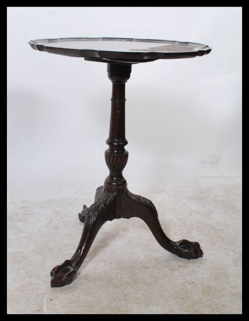 A 19th century mahogany tripod tilt top wine table raised on carved claw and ball feet with gadrooned vase column. The occasional table having a scalloped top with acanthus leaf carved supports.