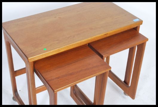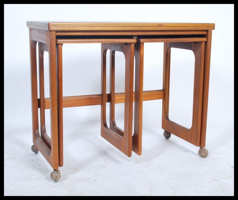 A retro 1970's Mcintosh of Kirkcaldy Scottish teak wood nest ot tables. The rectangular main table with smaller tables to underside. All raised on castors. Measures: 64cm high x 76cm wide x 40cm deep.