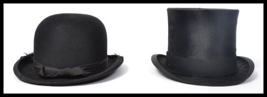 A vintage 20th century Moleskin top hat by H.M. Stanley together with a bowler hat of similar age by AJ White Ltd. Measures 15 cm high, 38 cm wide and 39 cm deep.
