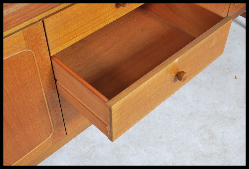 A stunning vintage / retro 20th Century teak wood 7 foot sideboard by Nathan. The central bank of three drawers flanked either side by double cupboard doors, raised on shaped supports united by stretchers. Measures: 78cm high x 213cm wide x 45cm deep.