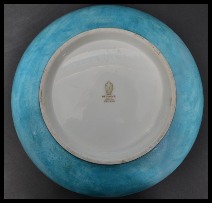 A fantastic Wedgwood fairyland lustre large bowl having a blue exterior with yellow interior The bowl having a silvered border with central medallion depicting Chinoiserie decoration with scenes of figures and foliage with gilt detailing. Wedgwood circa 1900 back stamp to base. Measures 11 cm high and 25.5 cm diameter.