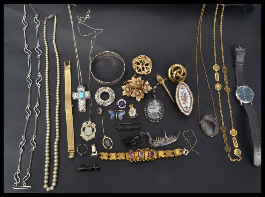 A fantastic collection of vintage jewellery to include a Chester silver hallmarked buckle bangle , a hard stone cameo centaur pendant , Whitby jet brooch , pinchbeck bracelet , silver butterfly wing brooch etc. Please see images.