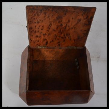 A good quality Amboyna wood tea caddy / cigar box of 20th century origin, unusual shaped form with angular sides  hinged top and polished interior.