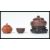 A vintage 20th century Yi Xing red clay Chinese tea pot and cup on wooden socle base along with another terracotta yi xing teapot.