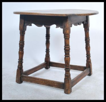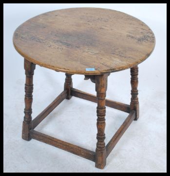 A Victorian 19th century oak tavern table. Raised on block and turned legs united by stretchers having a fitted frieze with circular table top above. 61x70