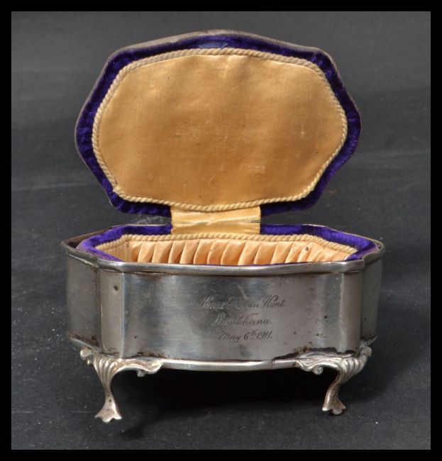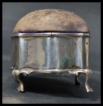 An early 20th century silver hallmarked box having a pin cushion lid raised on cabriole leg. Hunting interest inscription reading East Devon Hunt Gymkhana May 6th 1911. Measures 7 cm high, 11 cm wide and 8 cm deep.