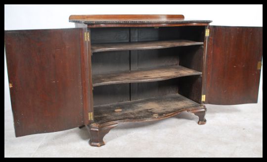 A 20th century Georgian revival serpentine fronted mahogany sideboard of small proportions. Raised on bracket feet with serpentine twin full length door housing shelving within. Flared top above. 85x100x50